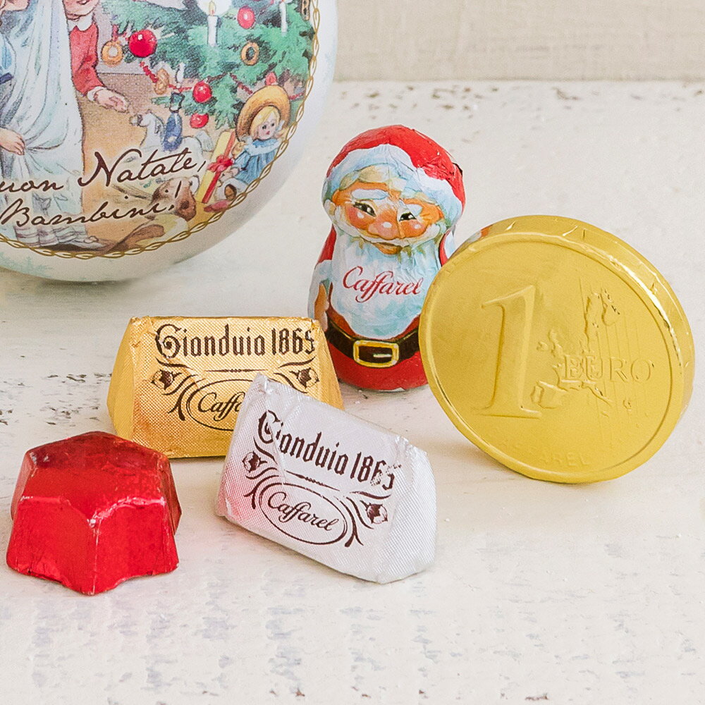 ●チョコレート 5粒入り ・ミニジャンドゥーヤ 1粒 ・ミニジャンドゥーヤビター 1粒 ・ミニスター 1粒 ・ユーロコイン 1粒 ・バッポナターレ(サンタクロース)1粒 ●缶サイズ:直径7cm(ひも6.5cm) ●個包装 ●原産国:イタリア ●メーカー/ブランド:カファレル (Caffarel) 【イタリア土産としてご利用不可】 ※輸入者シール(日本語/強粘)あり ※日本語リーフレット入り ※日本国内販売用のデザインです。