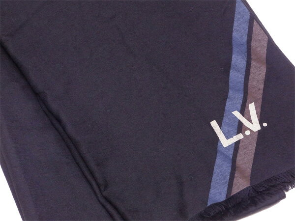 【P10倍】 【中古】 ルイ ヴィトン マフラー フリンジ付き ストール LVマーク ブラック×ブルー×ベージュ系 シルク42%カシミア29%ウール29% Louis Vuitton 【ルイ・ヴィトン】 T1266